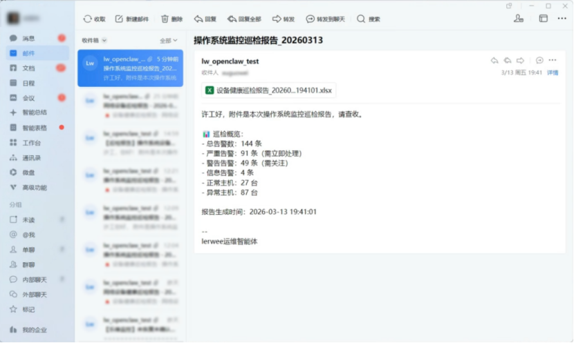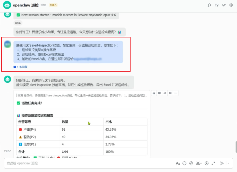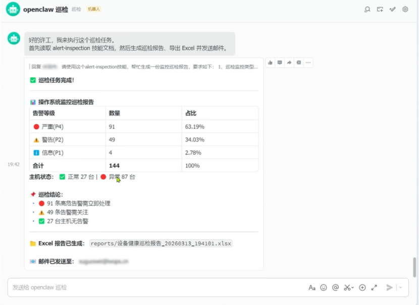 场景描述:该Skill的核心适配场景为设备健康巡检、告警审查与巡检报告生成(Markdown 格式)等,同时支持告警数据导出为 Excel与发送邮箱,全程无需人工干预,实现了巡检工作的全自动化,解决人工运维巡检耗时耗力且容易出现遗漏等问题。
