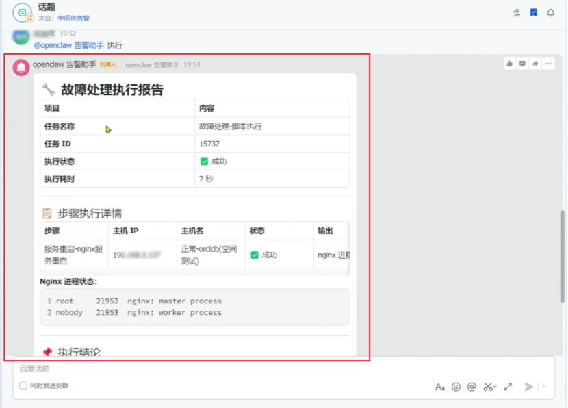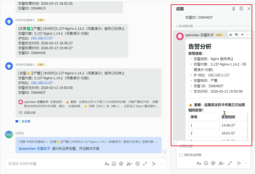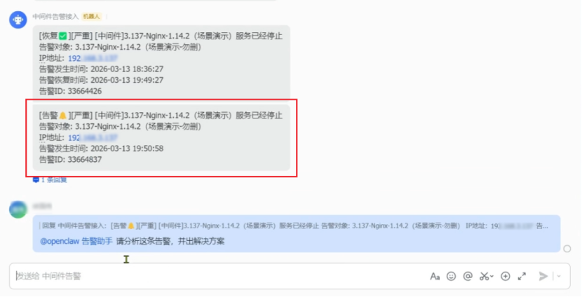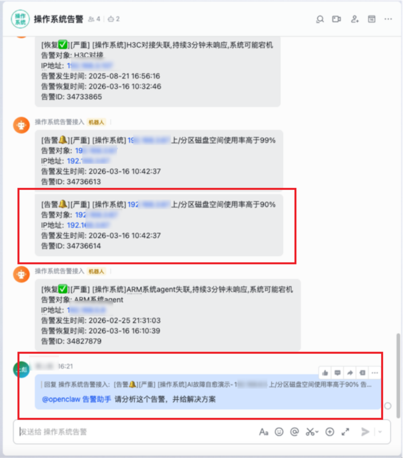 场景描述:该Skill的核心适配场景为告警自动处理。围绕告警全生命周期,打通了“告警 – 分析 – 处理 – 恢复” 的链路,将原本分散的告警监控、故障分析、脚本执行环节整合为一个有机整体,实现了从告警提醒到故障恢复的全流程自动化,打造了告警管理的闭环体系。