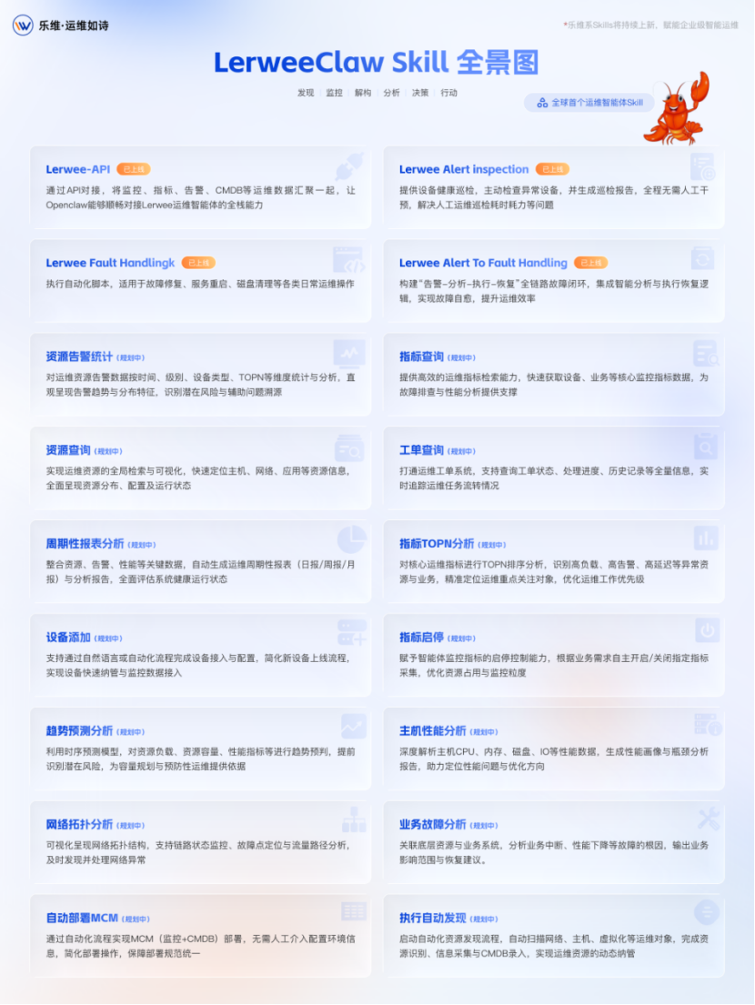 最近OpenClaw 直接火出圈!GitHub Stars 狂飙破 30 万,全网 “养小龙虾” 热潮直接拉满。当第一批跟风安装的小伙伴转头忙着卸载时,专注技术的3499拉斯维加斯早已跳出玩梗,把 OpenClaw 真正用在了智能运维的核心场景里。现在,LerweeClaw的全套技能它来了!
